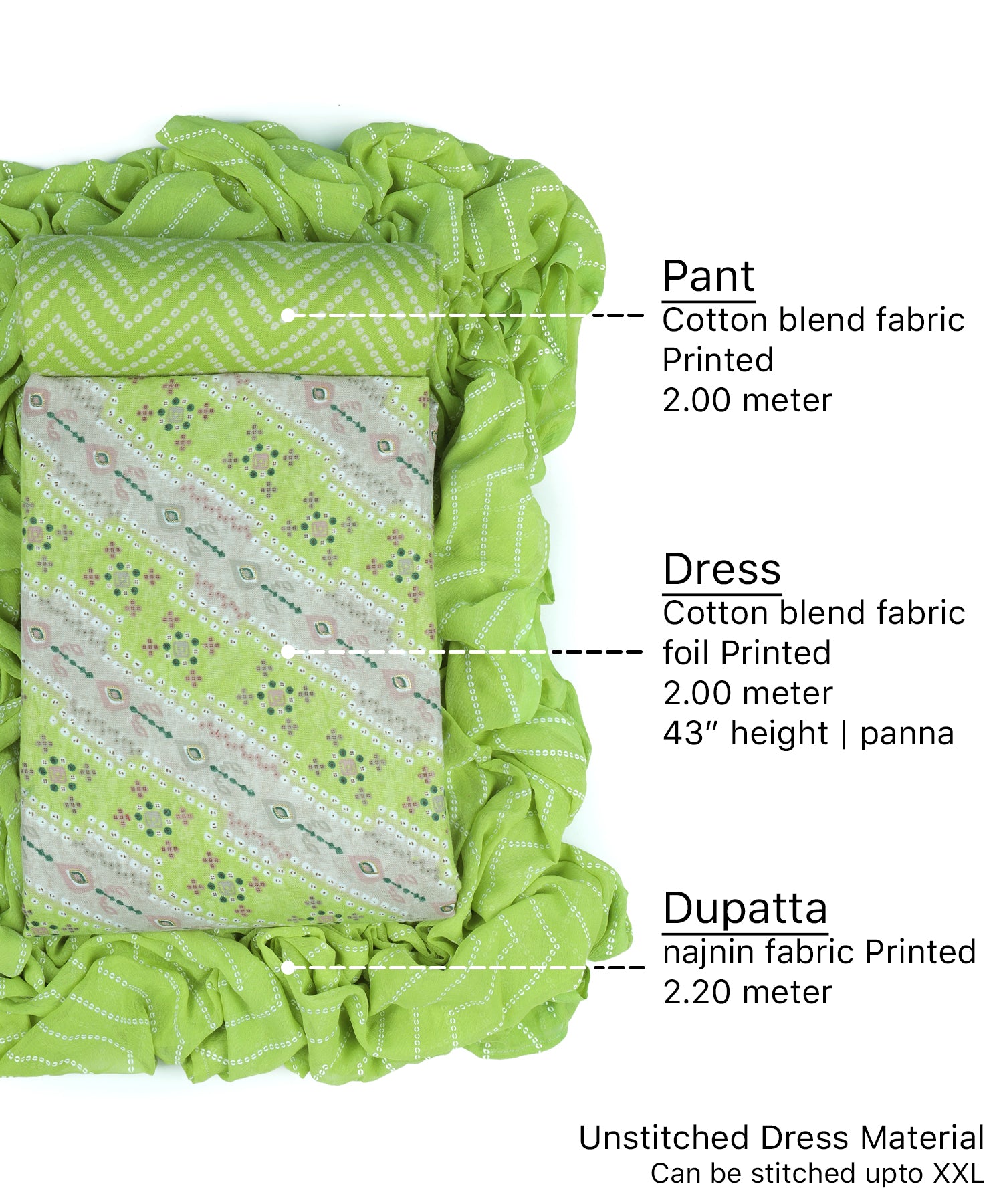 Unstitched cotton blend kurta fabric with bandhani print, 2.0 meter with 43 inch height dress material fabric can be stitched upto XXL kurta. 2.0 meter cotton blend fabric can be stitched into pant, palazzo, or churidar. To complete the set, it comes with 2.2 meter chiffon dupatta. The kurta set stitched will be lightweight and easy to maintain